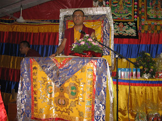 His Eminence Thritsab Gyabra Rinponche sprays the holy water into the pail containing crabs and fishes.